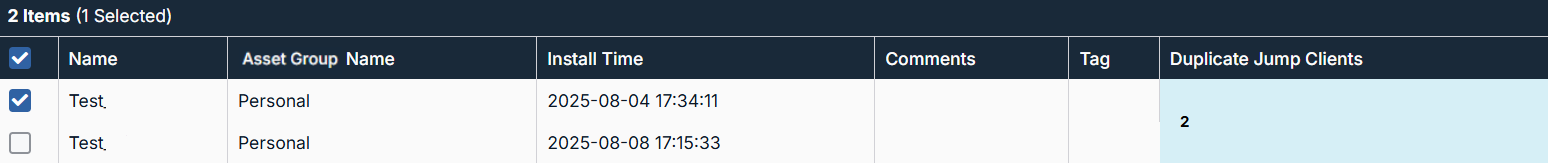 ExampleIn the table below, only one of the checkboxes to the duplicate name, Test, is selected. The name that is not selected is the original Jump client. However, when you click Delete Selected, the table result displays the No duplicate Jump Clients found message because the duplicate Jump client is removed.