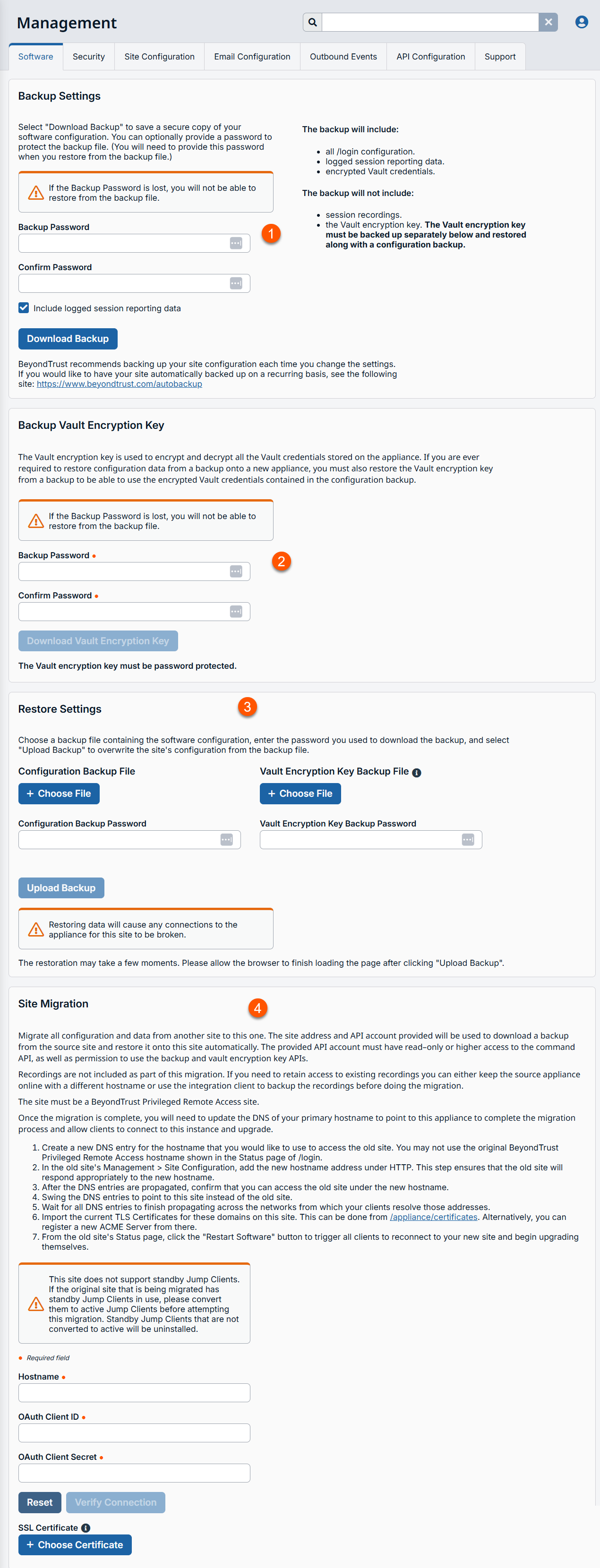 - Site Migration: Allows you to migrate configuration settings and data from another BeyondTrust Remote Support site.