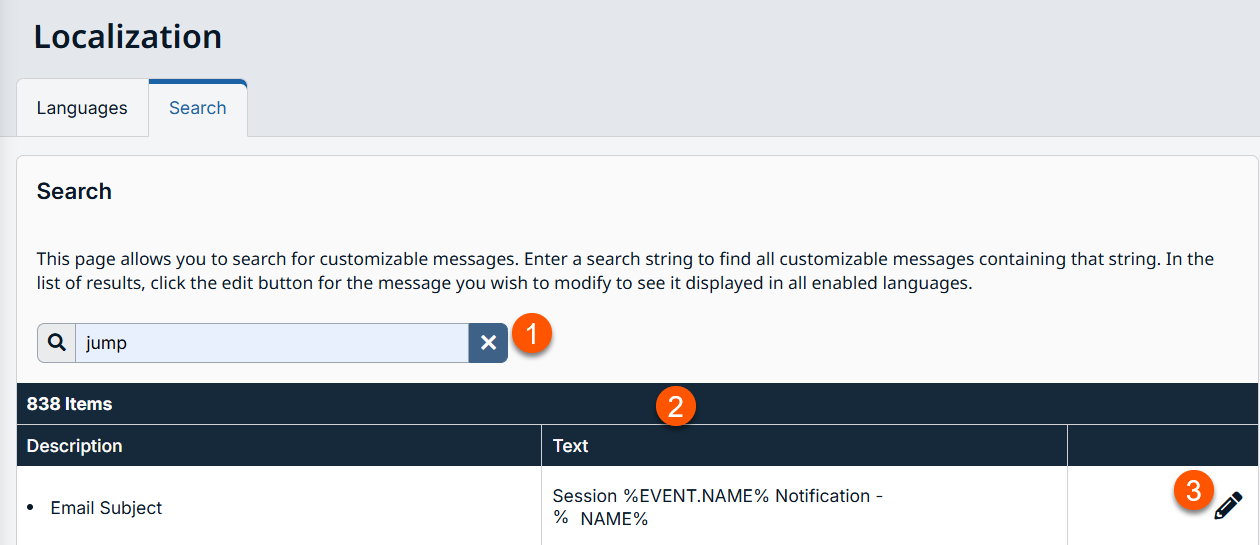 View all customizable messages on one page. Enter a word or phrase in the search box to narrow the field. Click on the message you wish to modify to see it displayed in all enabled languages. Each message can be modified individually from this page.