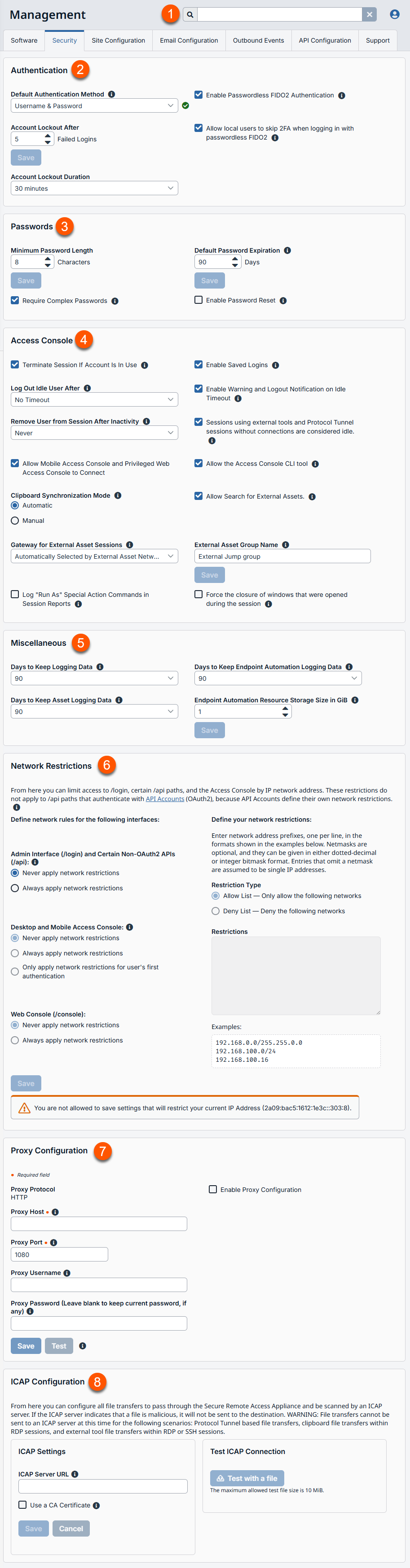 - Network Restrictions: Settings to limit access to the Admin interface, certain /api paths, and the Representative Console by IP network address.