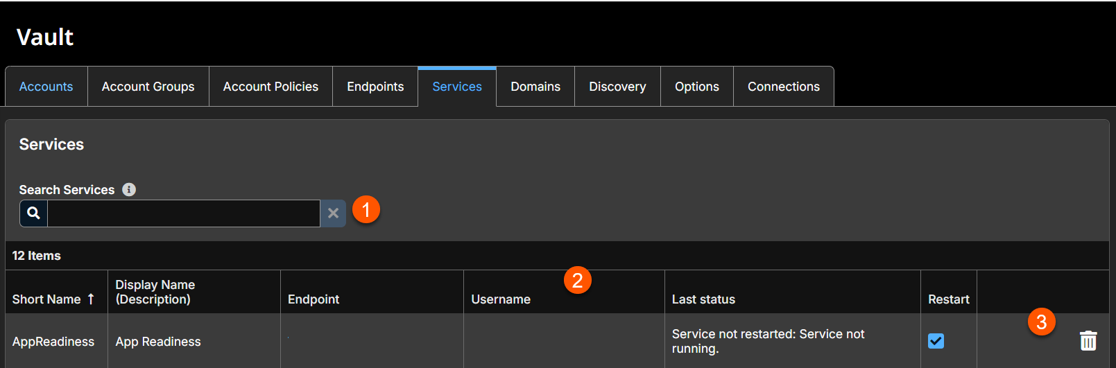 Search for specific services or a group of services based on Short Name, Description, Endpoint (Hostname) or Username.