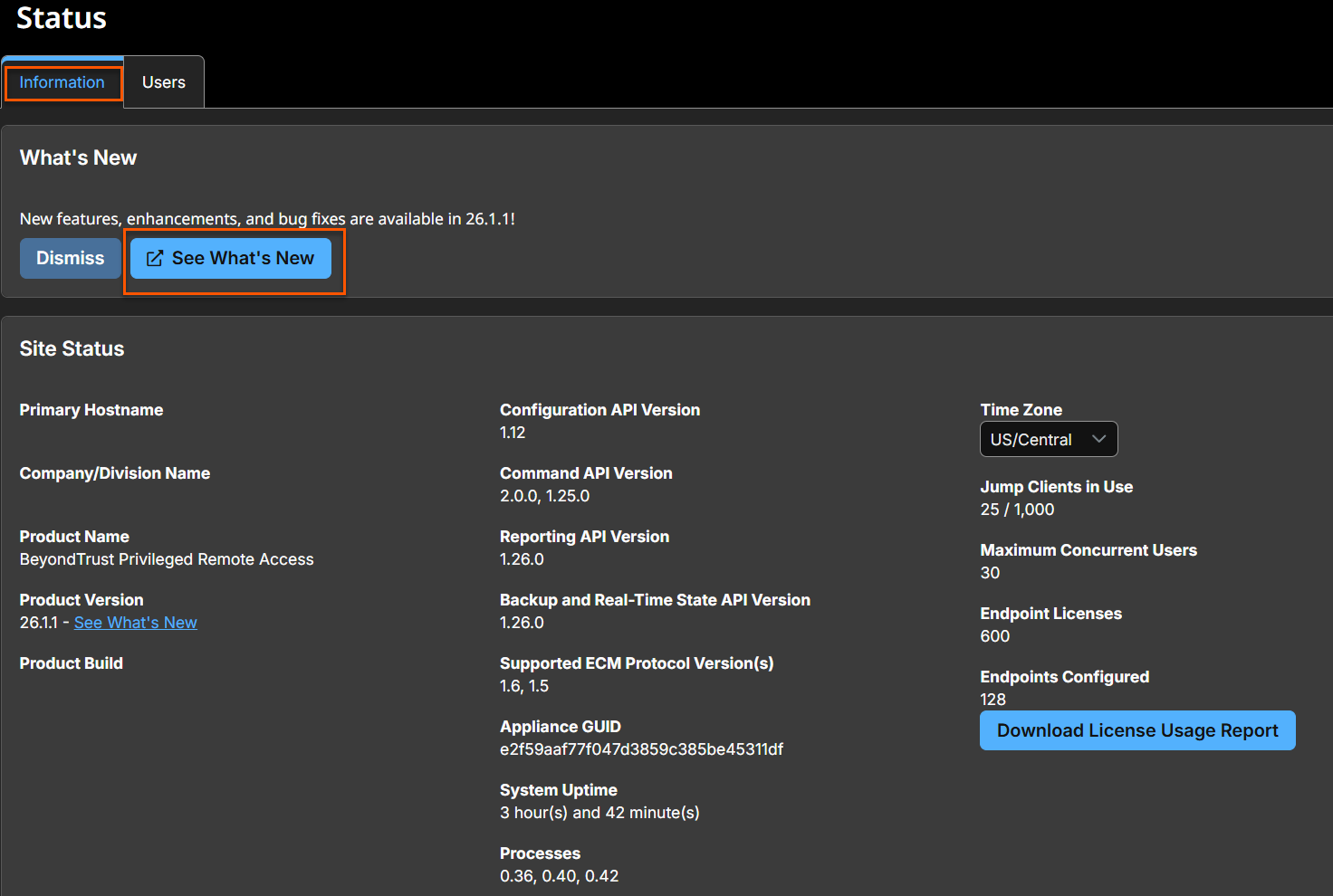 Gain insights into your site status, available client software, connected clients, and ECM clients. You can also see which of your representatives are logged in and communicate with them via the Users page, and view product release notes in the What's New page.
