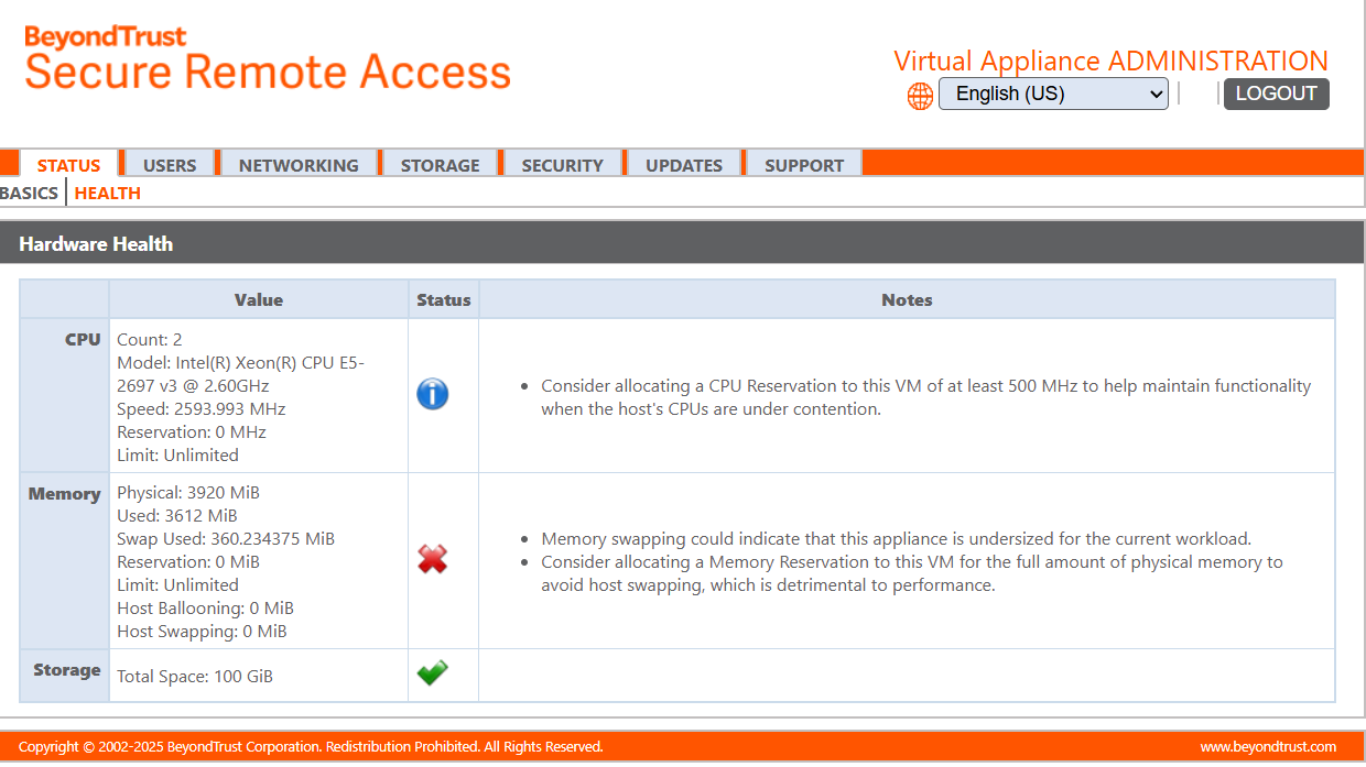 The Health page is available only for Virtual appliances