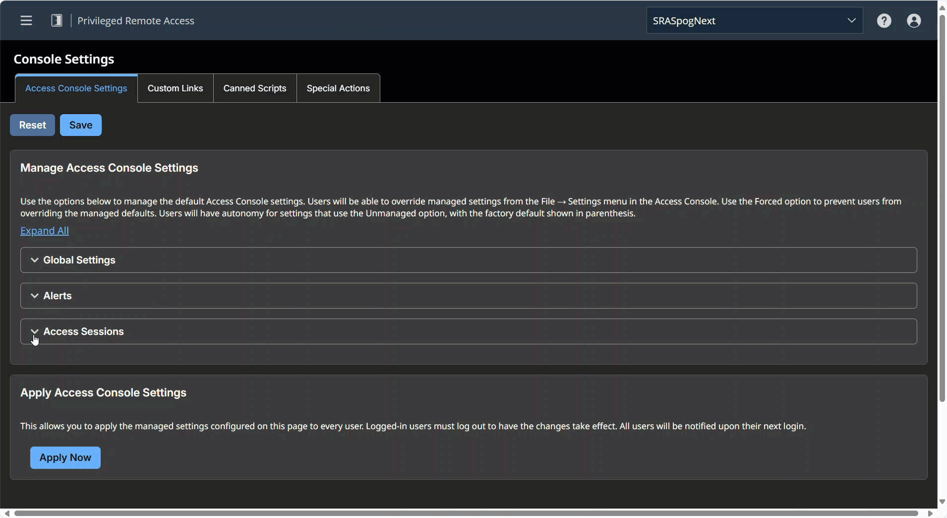 If, for instance, you wish to set up default settings for new users but leave existing users' settings unchanged, save your managed settings but do not apply them. This makes it so all new access console logins begin with your managed default settings. Existing users use forced settings applied upon next login, but all other settings remain unchanged.