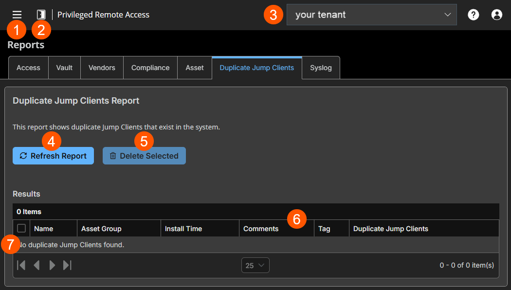- The ability to select items in the Duplicate Jump Clients table and the Delete Selected button require administrator permission. If you do not have this permission, the ability to select rows in the table and the Delete Selected button is not available on the report page.