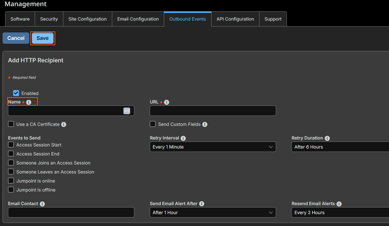 | Email Recipient | Configure up to 10 external email addresses that will be notified when certain session events occur. |