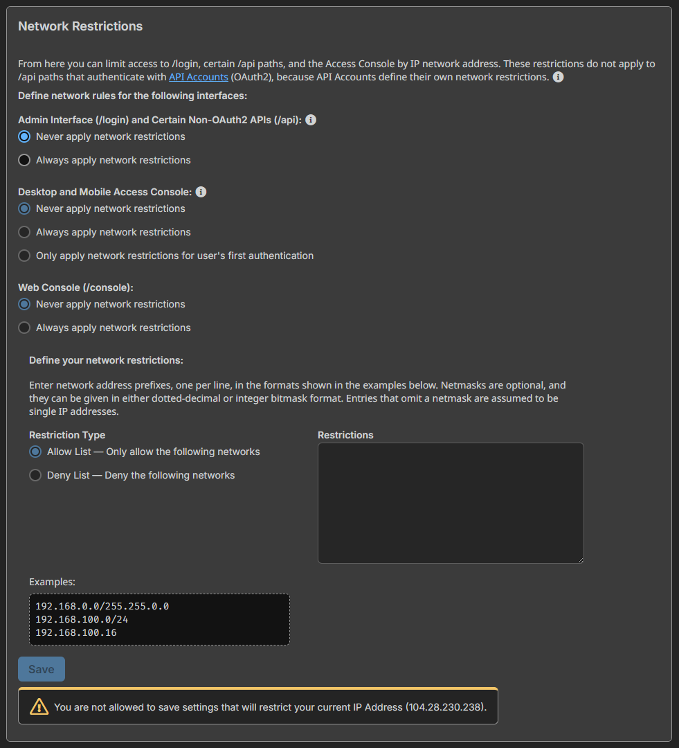 - Always apply network restrictions: when this is selected, the web access console inherits the restrictions entered for the admin interface.