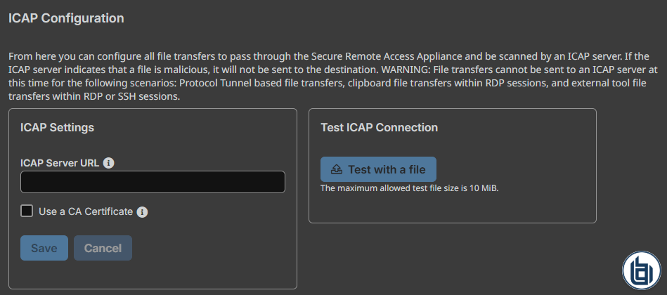 File transfers cannot be sent to an ICAP server in the following scenarios: Database Connection-based file transfers, clipboard file transfers within RDP sessions, and external tool file transfers within RDP or Shell sessions. Even with ICAP enabled, these transfers are not scanned.