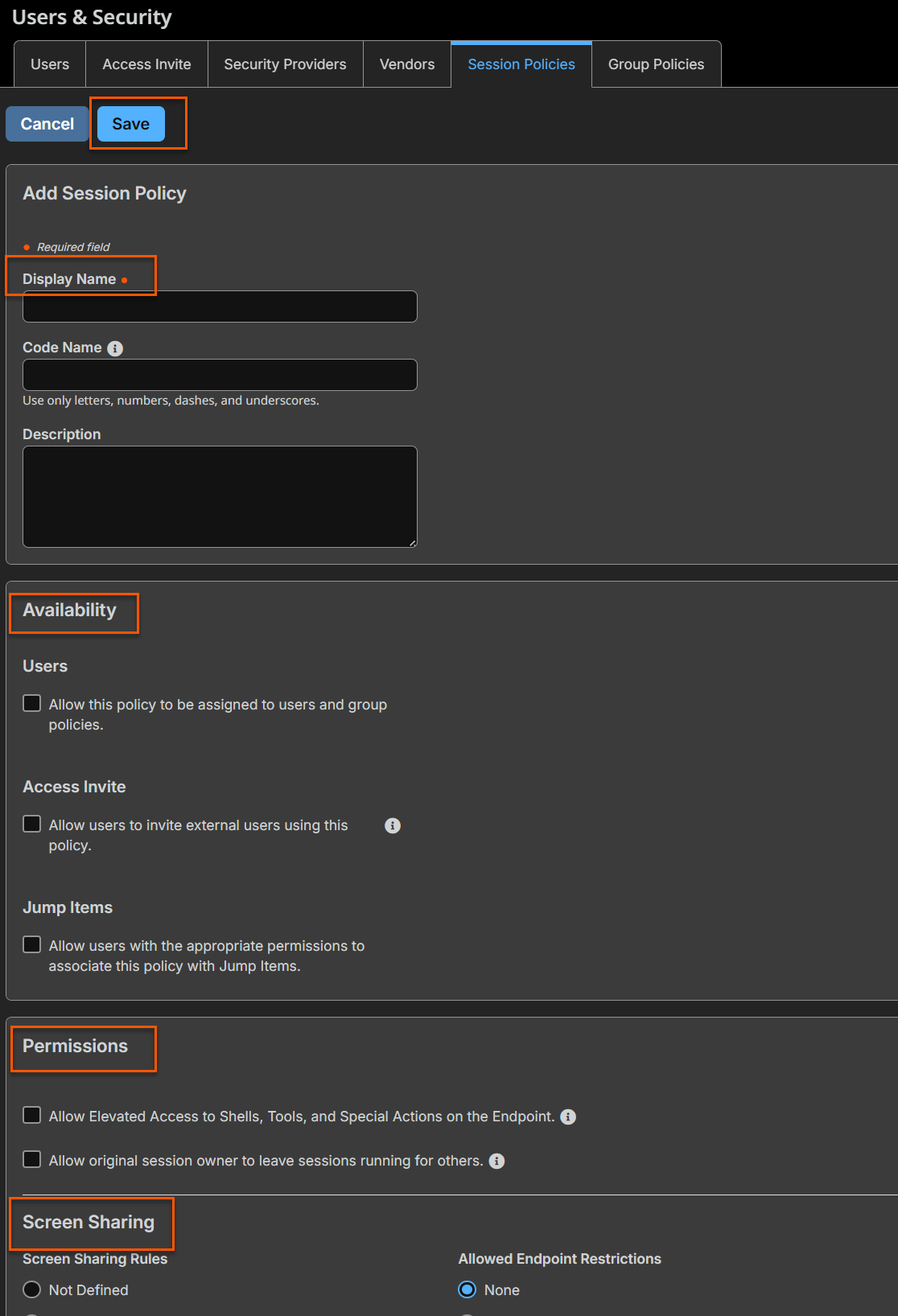 - Display Name: create a unique name to help identify this policy. This name helps when assigning a session policy to users and Jump Clients.
