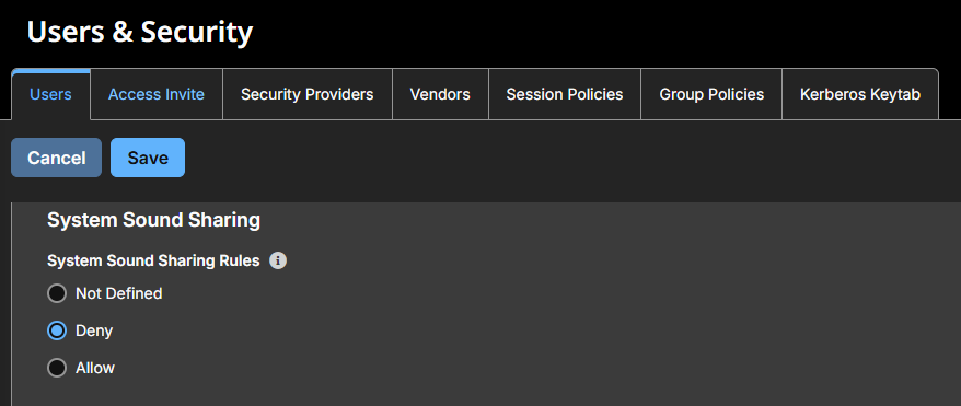 System Sound Sharing Rules: Allows the user to hear the endpoint's system sound during screen sharing when supported by the client. It does not allow access to the endpoint's microphone. If Not Defined is enabled, this option is set by the next lower priority policy. This setting may be overridden by a higher priority policy.