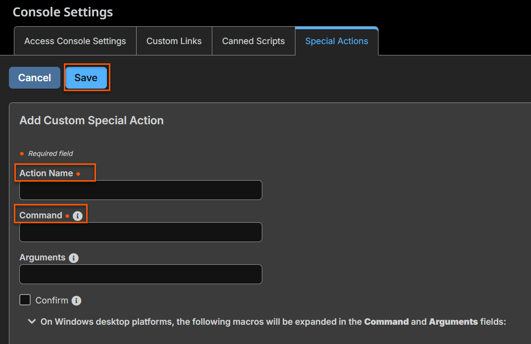 - For Confirm, if you check the Confirm checkbox, users are prompted to confirm they want to run this special action before it executes. Otherwise, when you select the special action from the menu during a session causes that special action to run immediately.