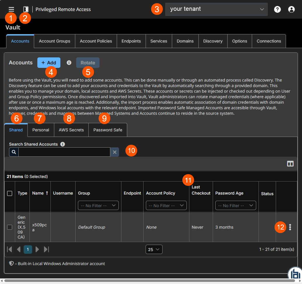 Vault is a secure storage solution that allows organizations to safely store and manage sensitive information, such as credentials and passwords, to ensure they are accessible only to authorized users. On the Accounts page, you can add, edit, and manage credential accounts. When you add accounts, it enables users with the correct roles to access the account credentials for injections and rotations.