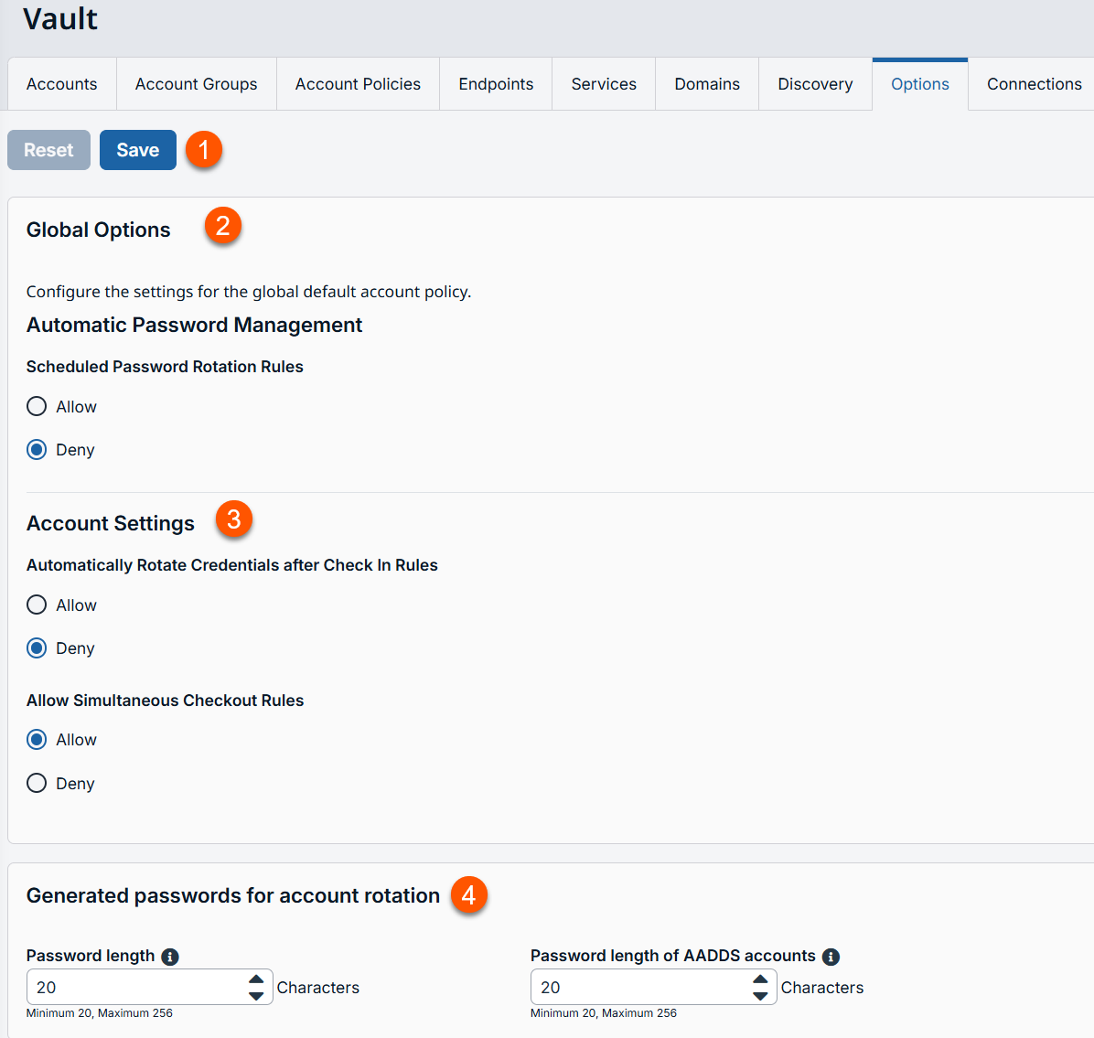 - When this option is set to Deny, if the account policy is connected with an account or account group, the credentials do not auto rotate when account is checked in.