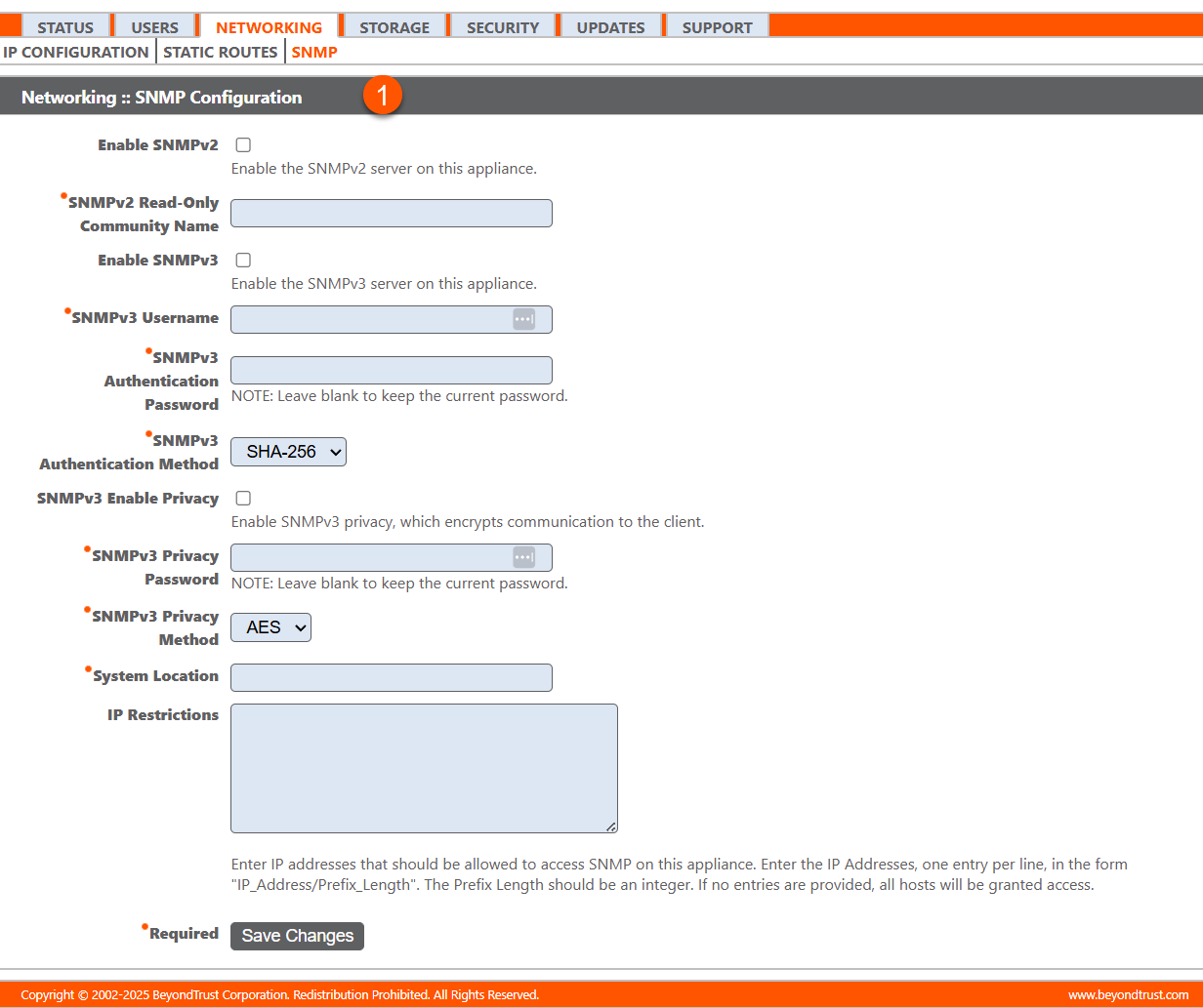 The SNMP page in the /appliance web interface allows you to configure Simple Network Management Protocol (SNMP) settings for monitoring the B Series Appliance. The BeyondTrust Appliance B Series supports SNMP monitoring for network, hard drives, memory, and CPU statistics, enabling tools to query the appliance for availability and other performance metrics. This page includes options to enable SNMP, set community strings, and configure SNMP traps for network monitoring systems.