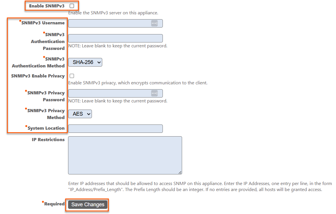 - SNMPv3 username: Enter a username for SNMPv3 authentication. This username is required for secure SNMPv3 communication with the appliance.