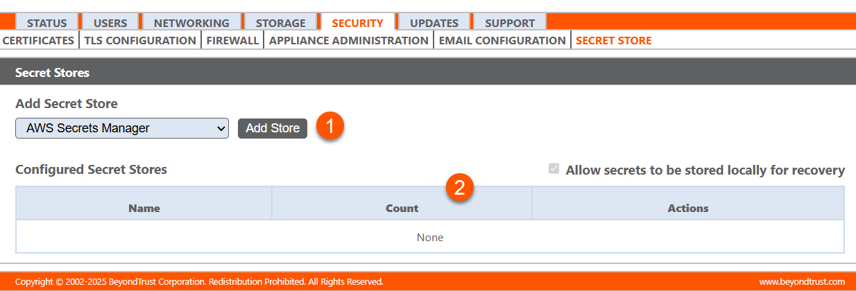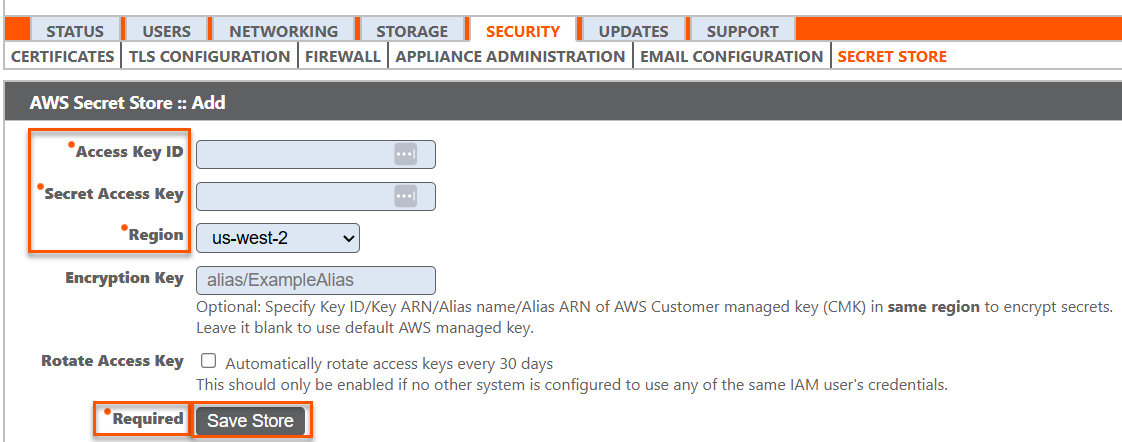 Create and manage secret keys stored in AWS to securely store encryption keys and site data. To add a secret store, select the store from the dropdown, and then click Add Store. Provide and save the information for the store as shown in the steps below.