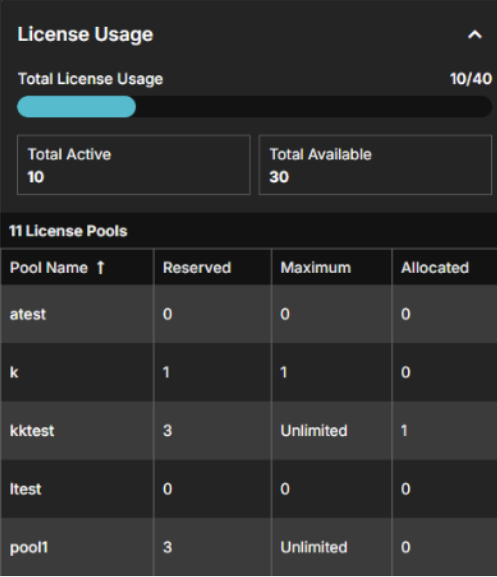 New License Usage panel, showing total active licenses, total available licenses, and total license pools.