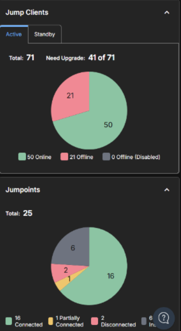 New Jump Clients panels, showing Online, Offline, and Offline (disabled) Jump Clients, and new Jumpoints panel, showing Connected, Partially Connected, and Disconnected Jumpoints.