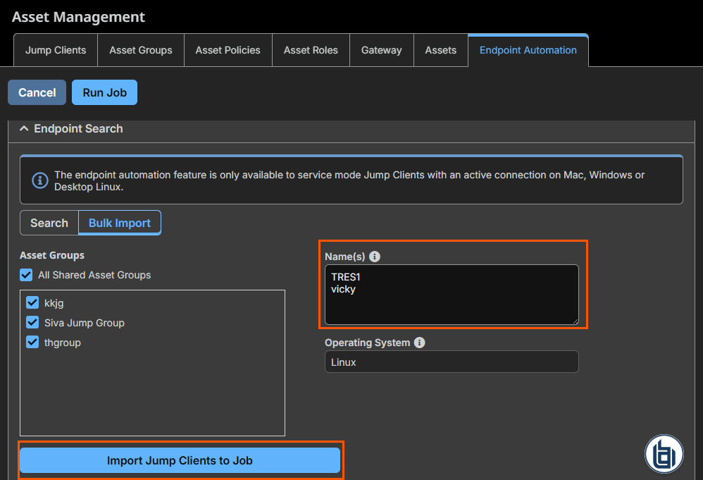 Endpoint Automation jobs can now target systems by importing or pasting a list of endpoint names (Jump Clients). Jobs run only against endpoints the user is authorized to access, and lists can be maintained for repeatable operations.