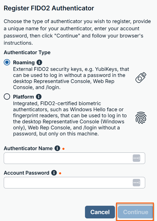 You can use FIDO2-certified authenticators to securely sign in to Remote Support, the Desktop Representative console, and the Web Rep console without entering your password.