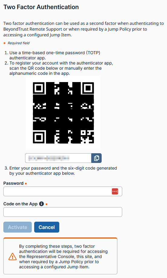 In Remote Support, scan the QR code, or, in your authenticator app, manually enter the generated code below the QR code.