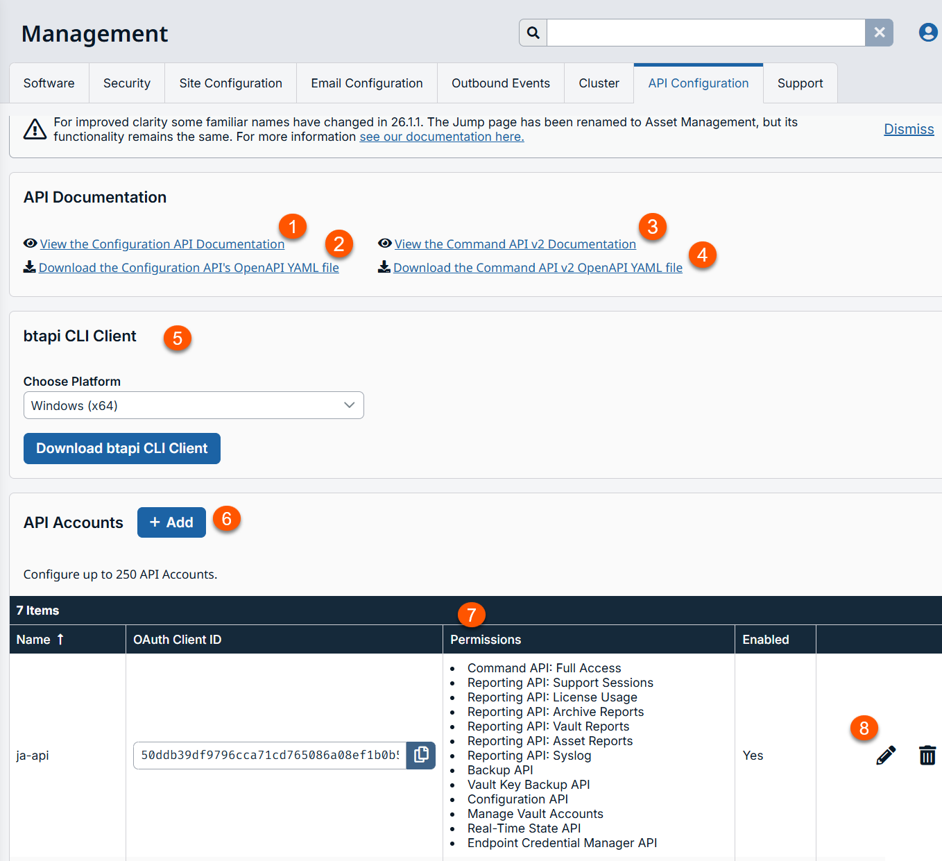 - btapi CLI Client: Downloaded to make it easier to use and configure APIs and automation scripts, and integrate them with your BeyondTrust Privileged Remote Access installation.