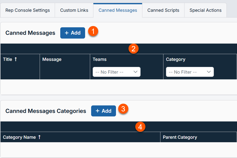 The Rep Console Settings page opens and displays by default. - At the top of the page, click Canned Messages.