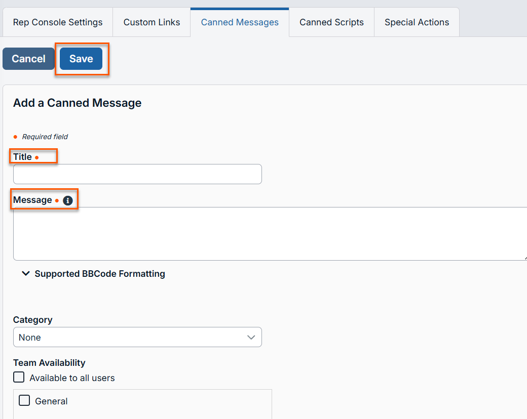 The Add a Canned Message page displays. - Enter a unique Title to help identify this message. This name should help representatives locate the message they wish to send.