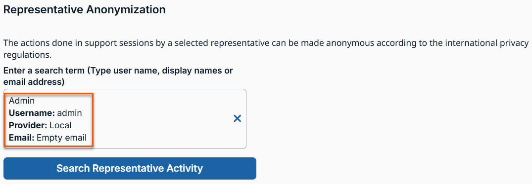 - Representative Anonymization: Search for users by user name, display name, or email address.