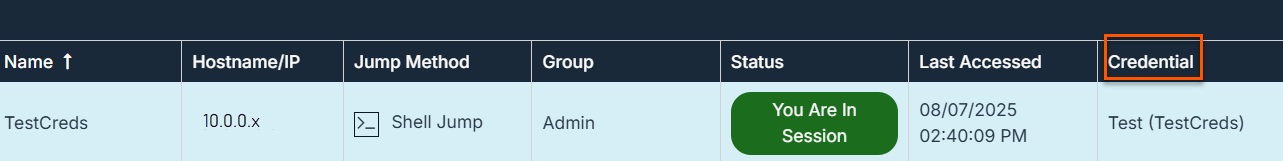 The Credential column displays a credential name which assists you in seeing which credential is being used in session. It is also used for auditing purposes.