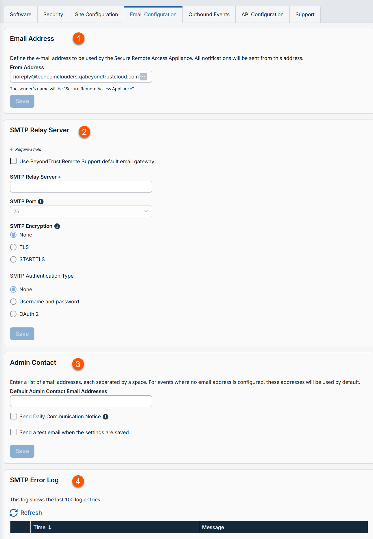 Email configuration allows administrators to set up and manage email notifications for various events within the BeyondTrust system, such as session invitations, alerts, and updates.