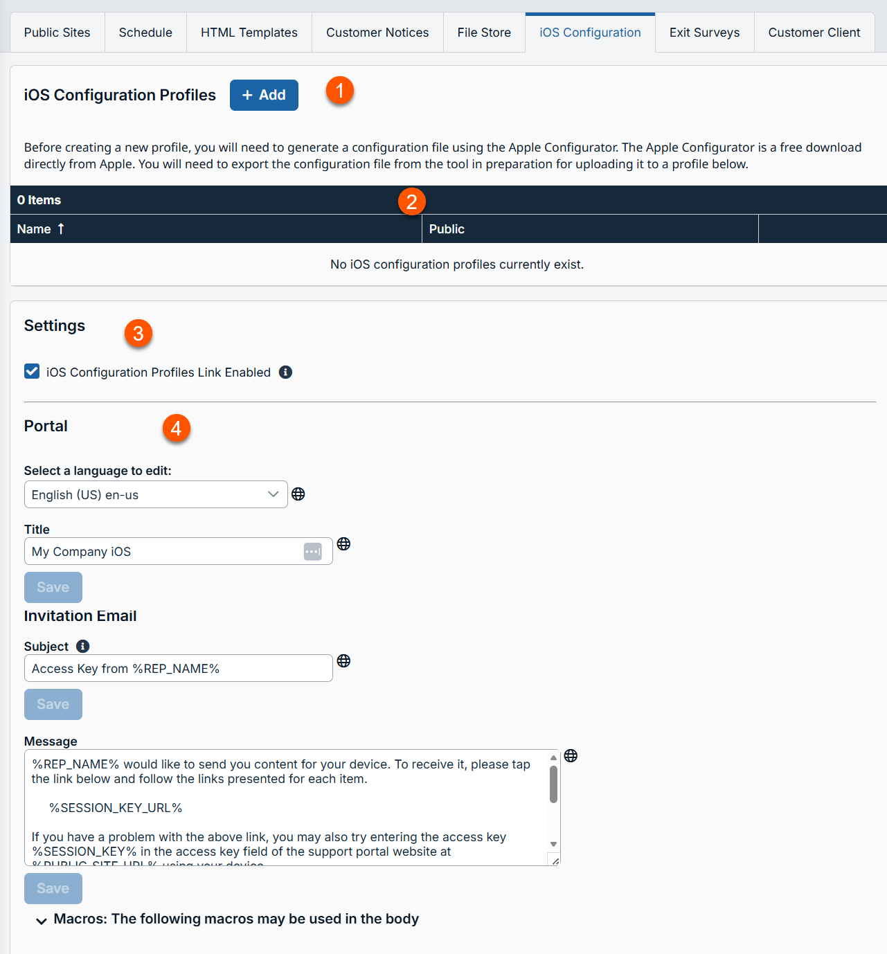 If this option is checked, customers on iOS devices will see a link to the iOS configuration profiles portal when they access the public site. This page displays any public profiles you have available, and it provides a text entry box where customers can submit an access key their representative has provided, directing the customers to a private configuration profile.