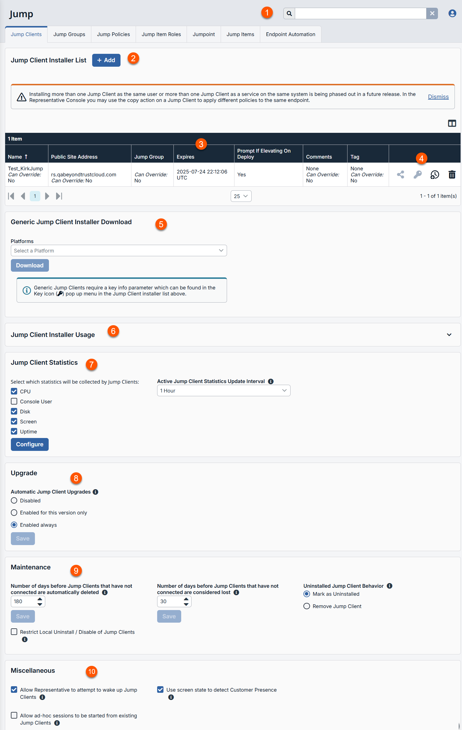 Jump Client Statistics: Displays statistics of the Jump Clients.
