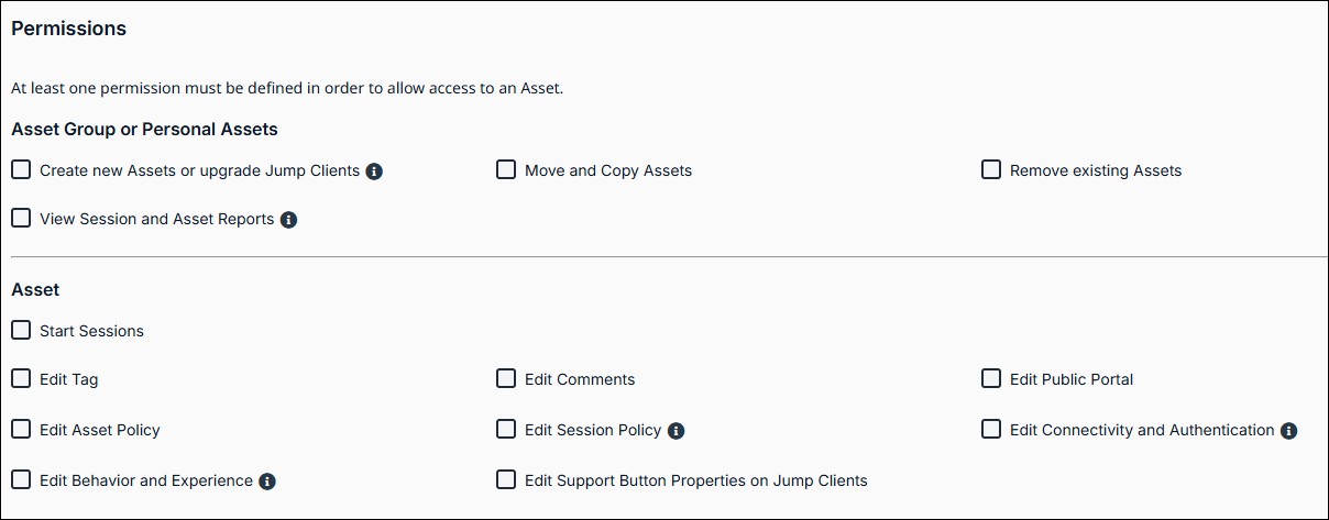 | Create new Assets or upgrade Jump Clients | With this setting selected, you can create Assets and install them on a remote system. This permission is required to upgrade Jump Clients through the Representative Console and Web Rep Console. It is also required for access to the Assets Mass Import Wizard. When you create an Asset Role and have this permission selected, all the Edit permissions in the Assets section are automatically selected and the following message displays: ℹ️The user must be a member of a Gateway to deploy. |