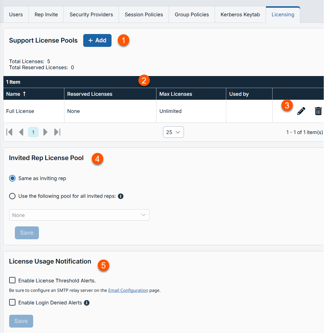 - For Reserved Licenses, This is the number of licenses which should be reserved for this pool. If all other licenses are in use and a representative who is not part of this pool tries to log into the Representative Console, then they will be denied login. The default value is 15 pools available.