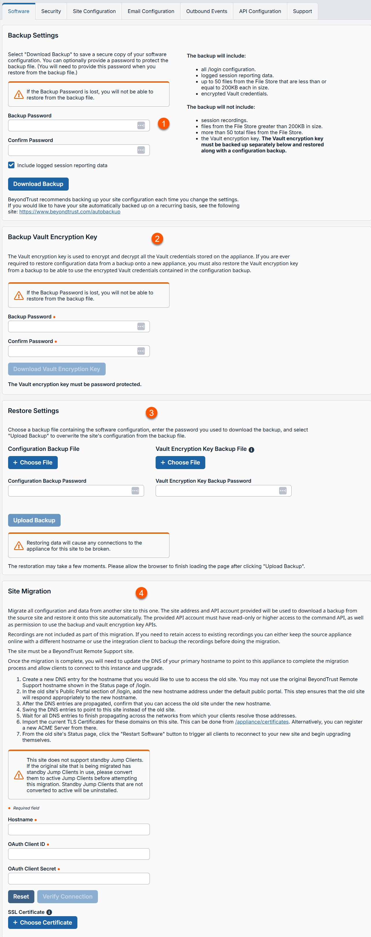 - Site Migration: Allows you to migrate configuration settings and data from another BeyondTrust Remote Support site.