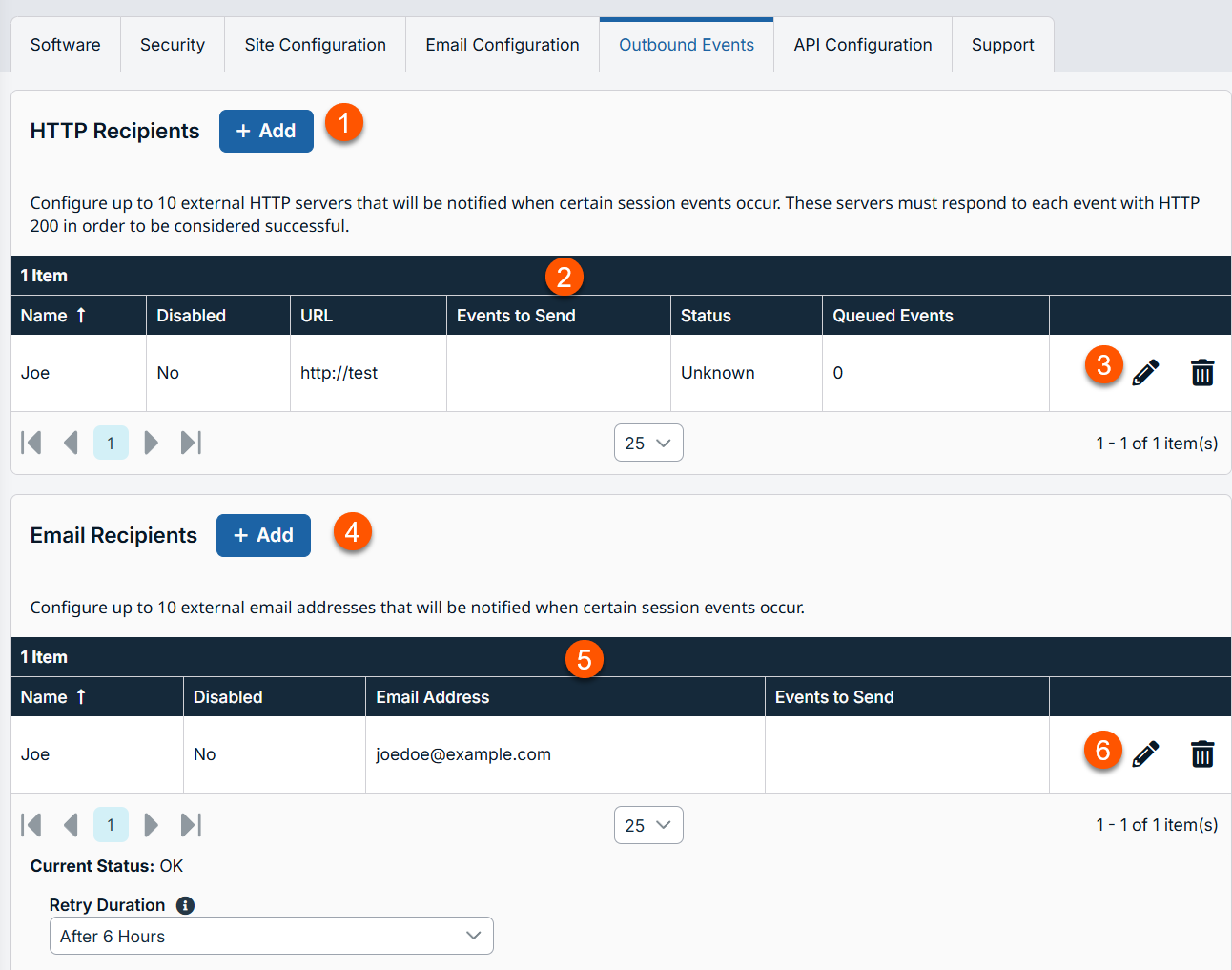 HTTP recipient list options: Edit or delete a HTTP recipient.