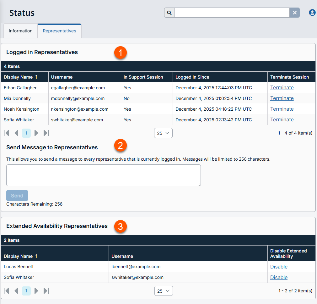 - Extended availability representatives: See which representatives have extended availability enabled.