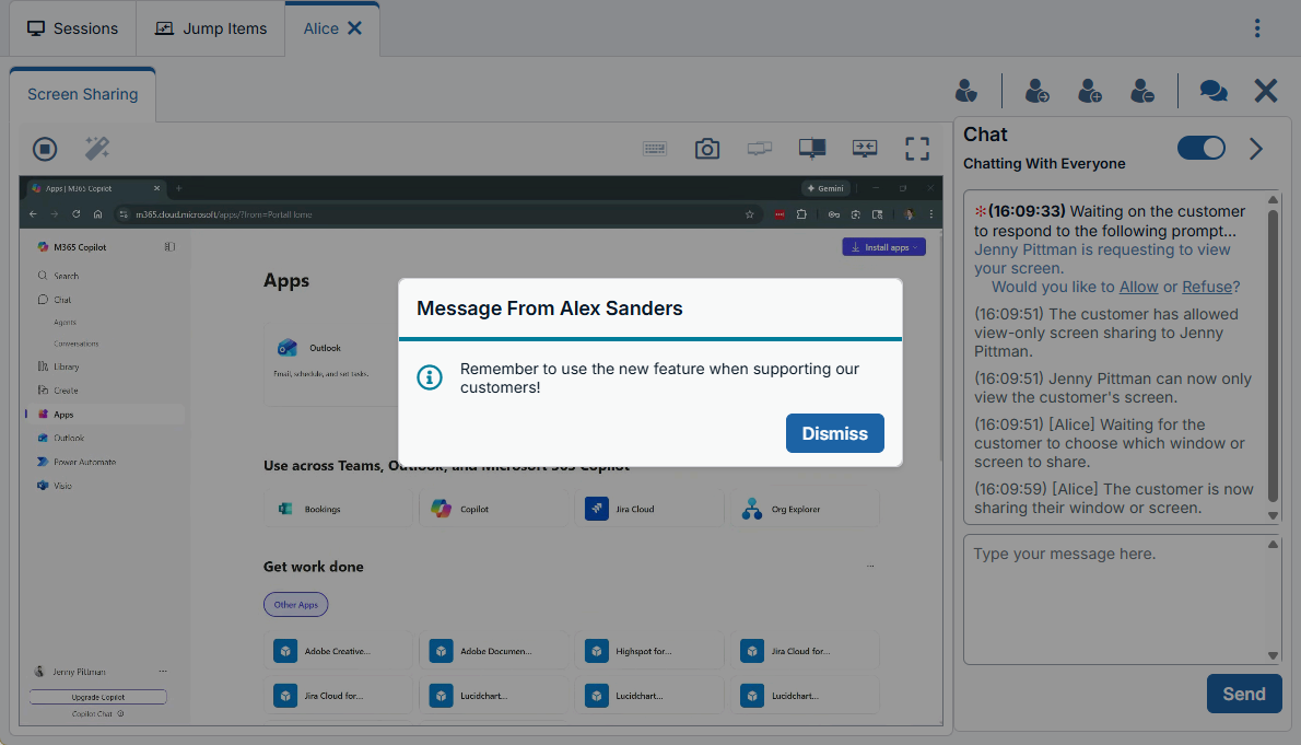 The message sends immediately, and representatives receive a pop-up message in the Remote Support console.