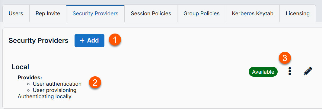 The Users page opens and displays by default. - At the top of the page, click Security Providers.