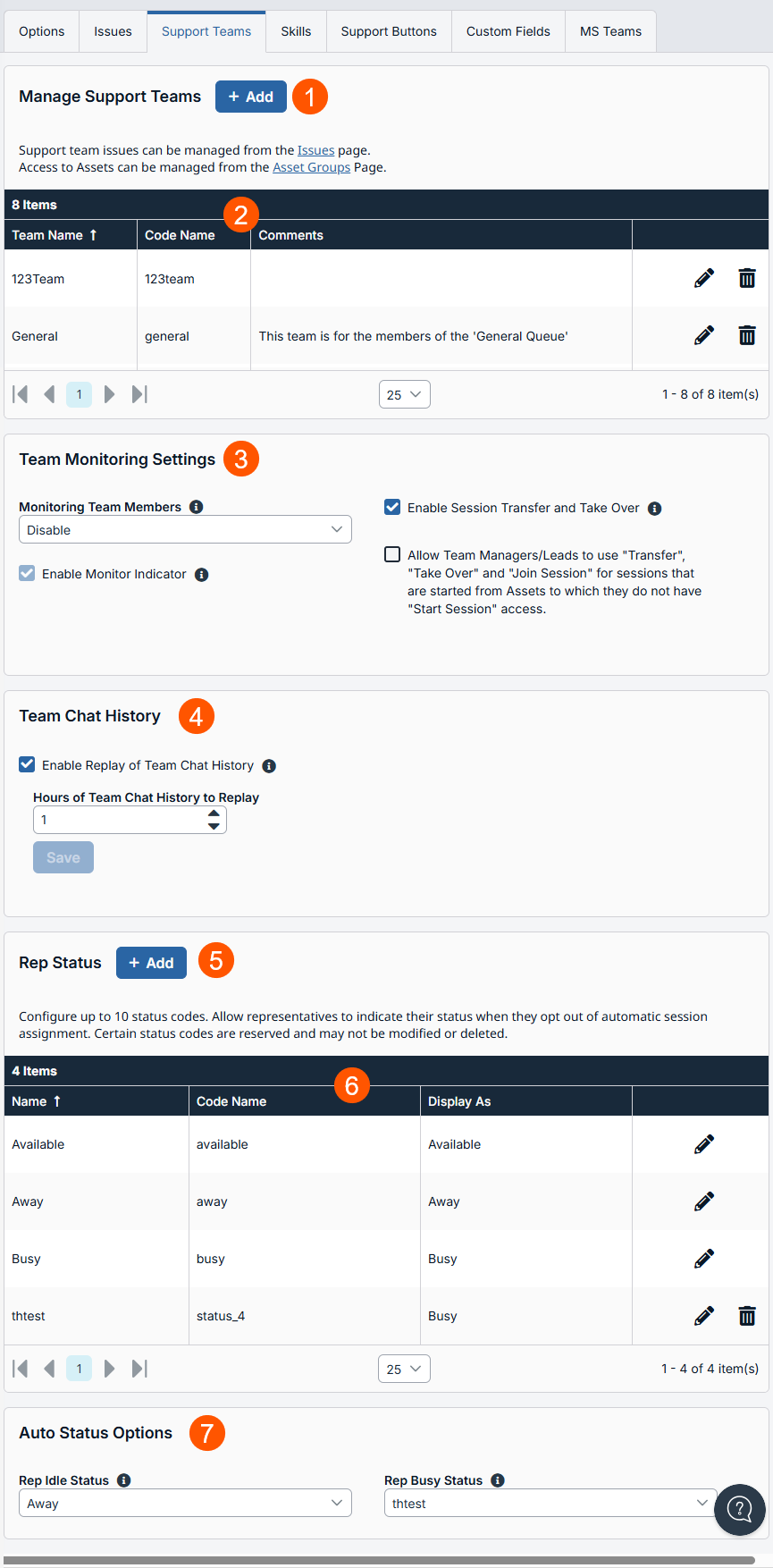 The Options page opens and displays by default. - At the top of the page, click Support Teams.