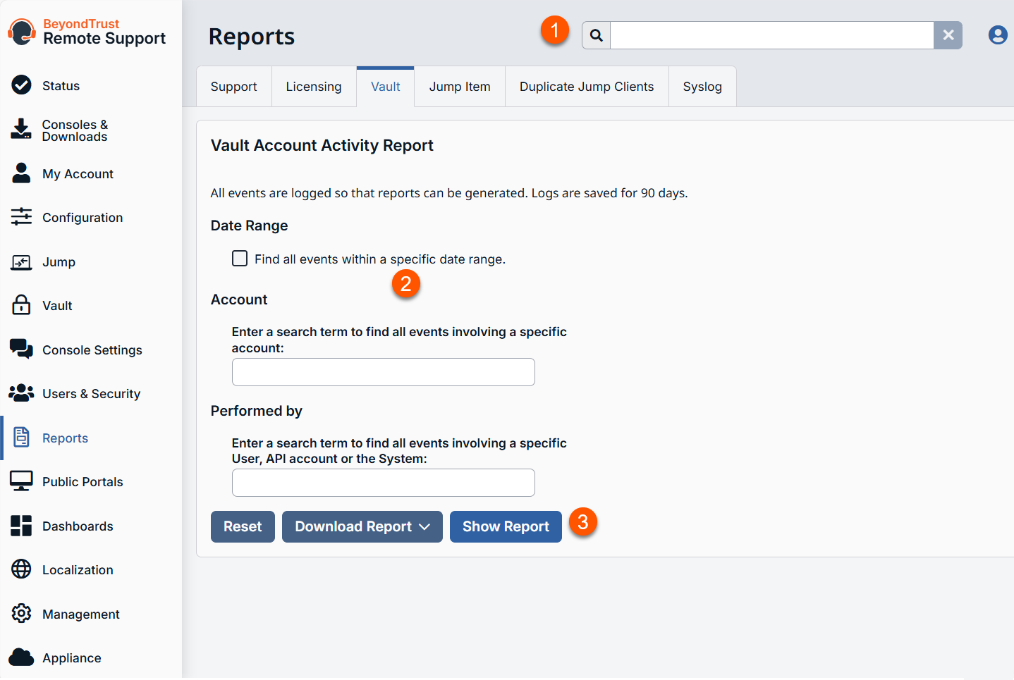 - Vault Account Activity Report: Generate a report based on filters.