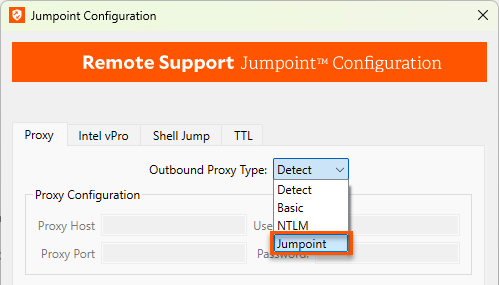 - From the dropdown on the Proxy tab in the Jumpoint Configuration application, select Basic or NTLM to configure proxy settings.