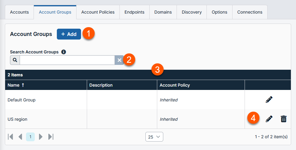 You can filter the list of available account groups by using the Search Account Groups box. Based on the account type, you can use Name or Description as the criteria to search.