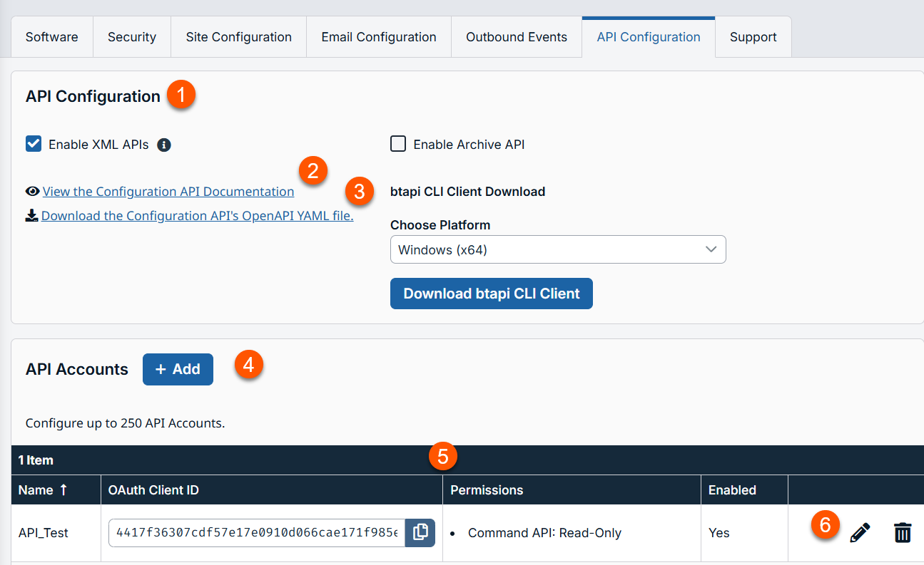 The API Configuration page displays. - From the API Accounts table, select an account you wish to delete.