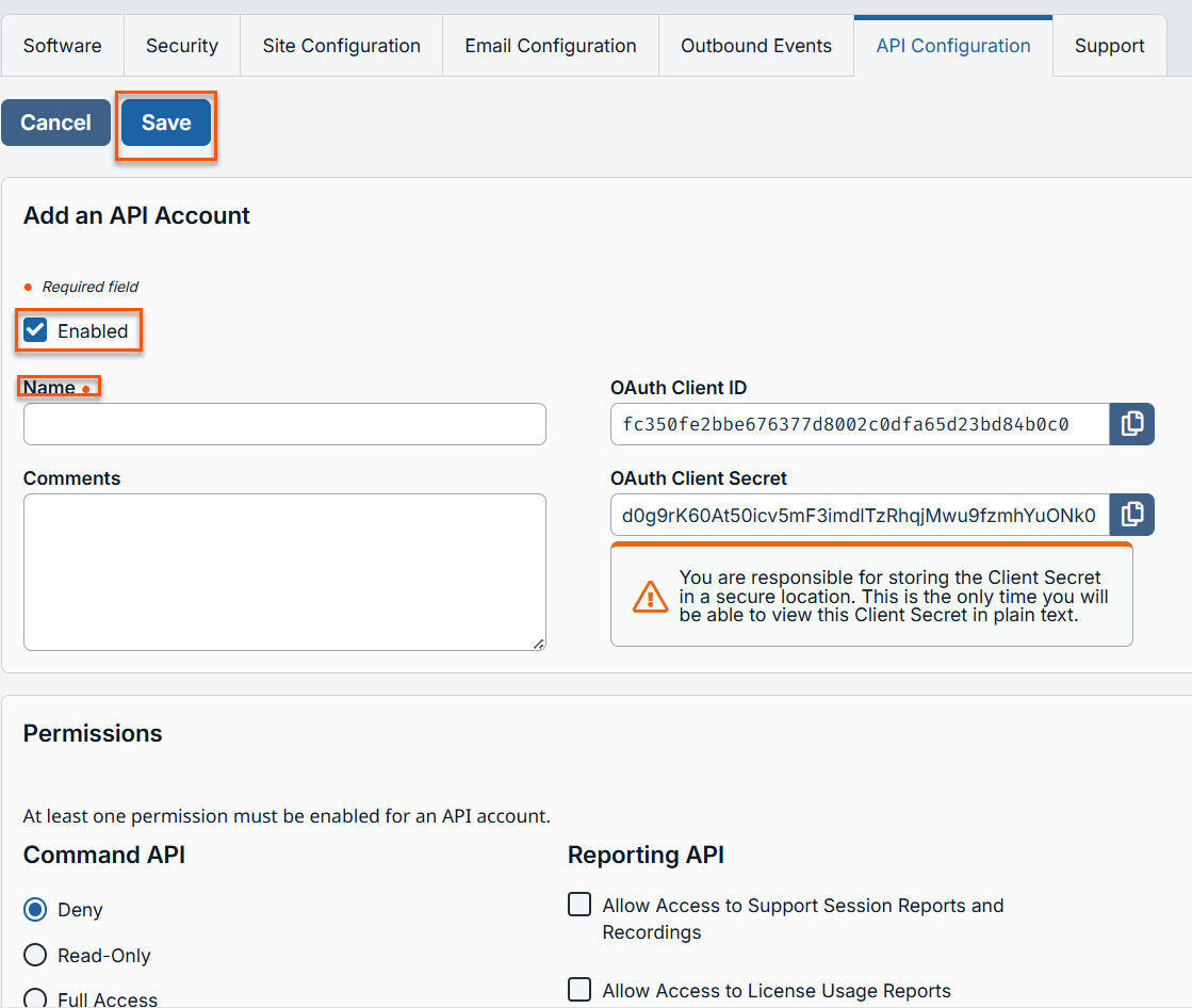 Choose to enable the BeyondTrust XML API, allowing you to run reports and issue commands such as starting or transferring sessions from external applications, as well as to automatically back up your software configuration.