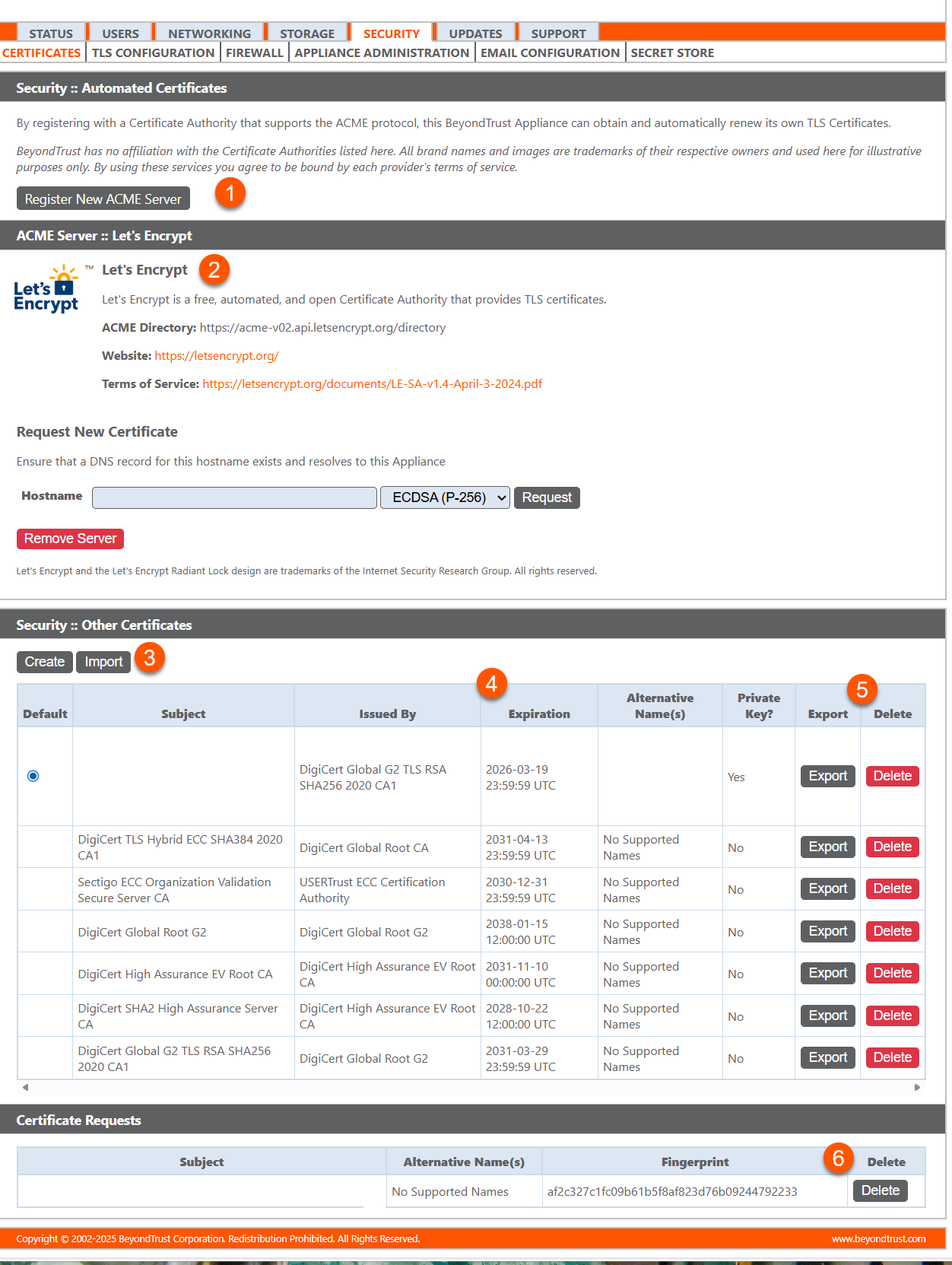 The Security page in the B Series Appliance web interface enables administrators to manage TLS certificates, create self-signed certificates, generate certificate requests, and import certificates signed by a certificate authority (CA). It also supports obtaining and automatically renewing TLS certificates from Let's Encrypt.