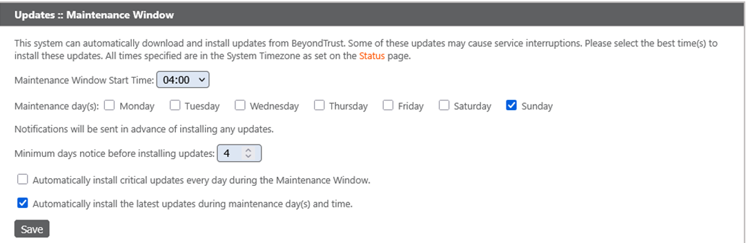 The B Series Appliance periodically checks for critical updates and emails the admin contact person when updates are available. You can select if you want the updates to install automatically and use the dropdown menu to select a time for the installation.