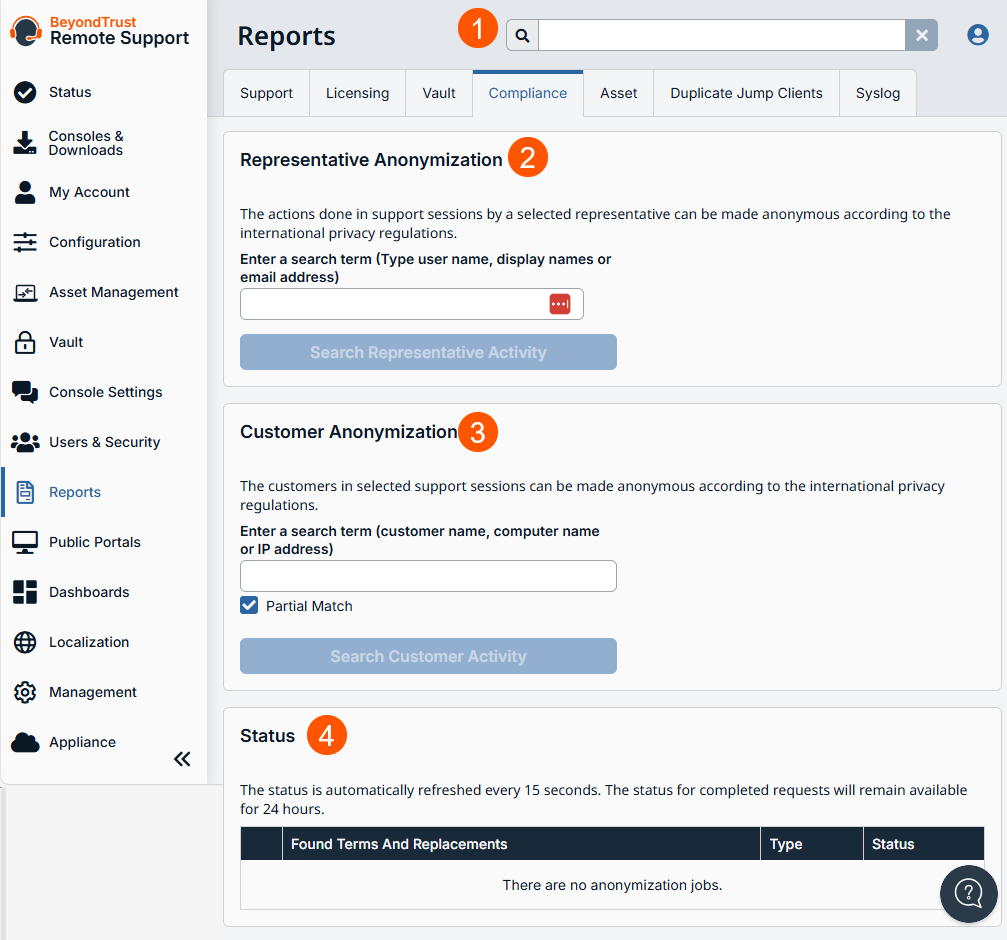 Important informationBy default, the Compliance tab is disabled. If your organization requires this functionality, contact BeyondTrust Technical Support.