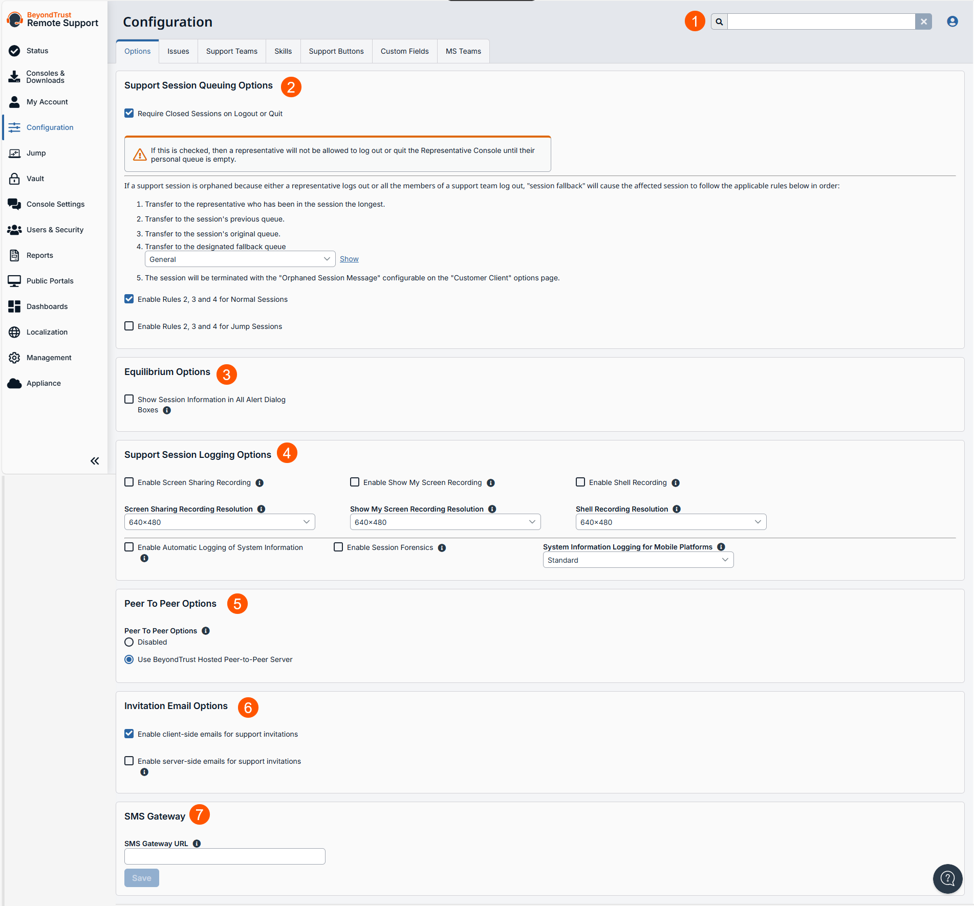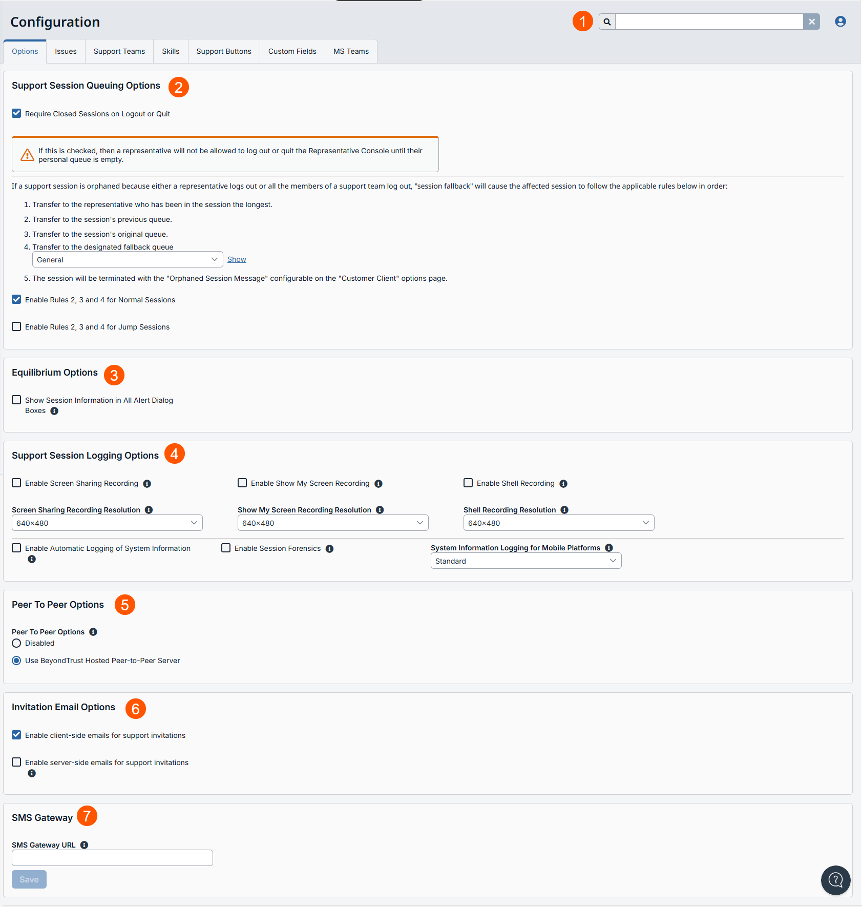 Go to Configuration>Options to determine how representatives receive and manage support sessions in their queue.